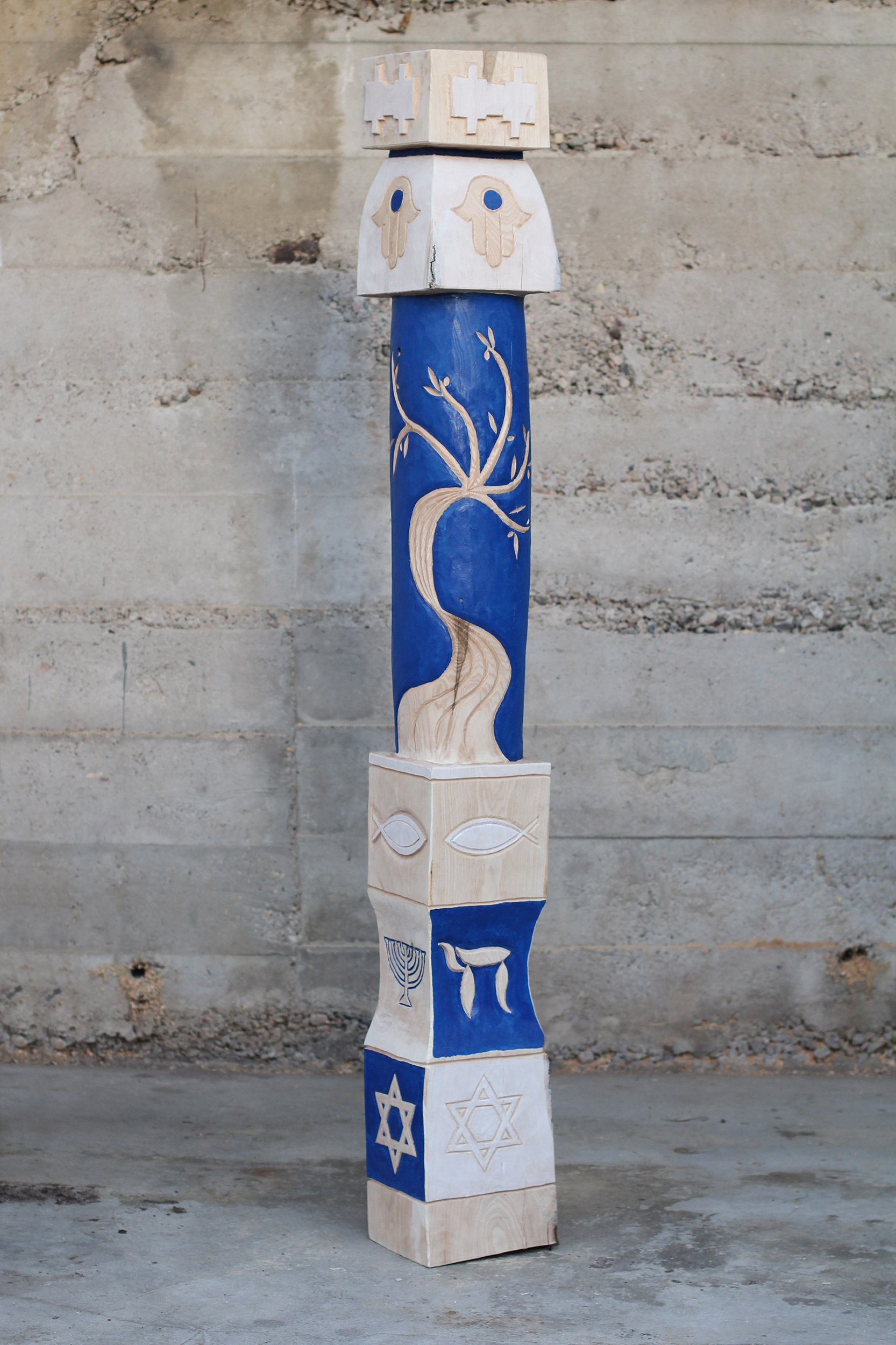 Der Totem ist bei ethnischen Völkern ein Symbol der verwandtschaftlichen Verbundenheit zwischen Gruppe/Stämmen und einer bestimmten Naturerscheinung. Die Säule ist daran angelehnt. Der Olivenbaum steht für das Volke Israels, getragen von dem Fisch als Fruchtbarkeitssymbol sowie dem Chai und der Menora – stehend für das Leben und die Schöpfung. Über dem Baum befindet sich die schützende Hand der Miriam. Als oberer Abschluss, über allem stehend, ist die Thora – eine Art Regelwerk für das Leben nach dem jüdischen Glauben. Die Farbe Blau des Himmels steht im Judentum für Gott, Glauben und Offenbarung, Weiss bedeutet Reinheit und Heiligkeit – die Farben der israelischen Flagge.